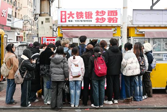 “看,现在排队已经里三层外三层了。”如今,李彬这个不足两平方米的“大铁锹炒面”小吃摊成了学校门口一道温暖的风景。