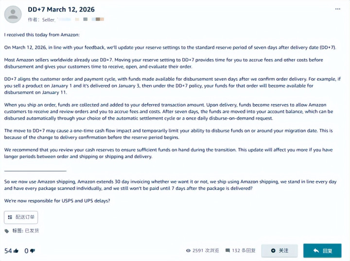 通知显示,2026 年 3 月 12 日起,亚马逊将全面实施“DD+7”资金预留政策。
