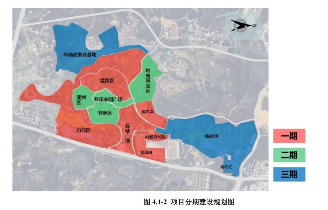 该项目初步考虑分为三期进行规划建设,其中,首期建设区域包括荔枝广场、自驾区、猛兽区、后勤管理区和 P1、P2 停车场等;二期建设区域包括欢乐广场、亚洲区、非洲区、岭南国宝区等;三期建设区域包括雨林区、预留区等。本次招标的是一期先行区(猛兽区)。