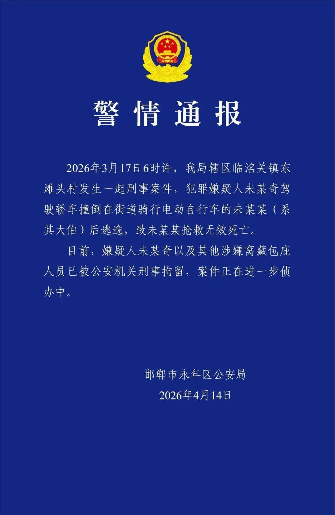央视网消息:4月14日,河北邯郸市永年区公安局通报:3月17日6时许,该局辖区临洺关镇东滩头村发生一起刑事案件,犯罪嫌疑人未某奇驾驶轿车撞倒在街道骑行电动自行车的未某某(系其大伯)后逃逸,致未某某抢救无效死亡。目前,嫌疑人未某奇以及其他涉嫌窝藏包庇人员已被公安机关刑事拘留,案件正在进一步侦办中。