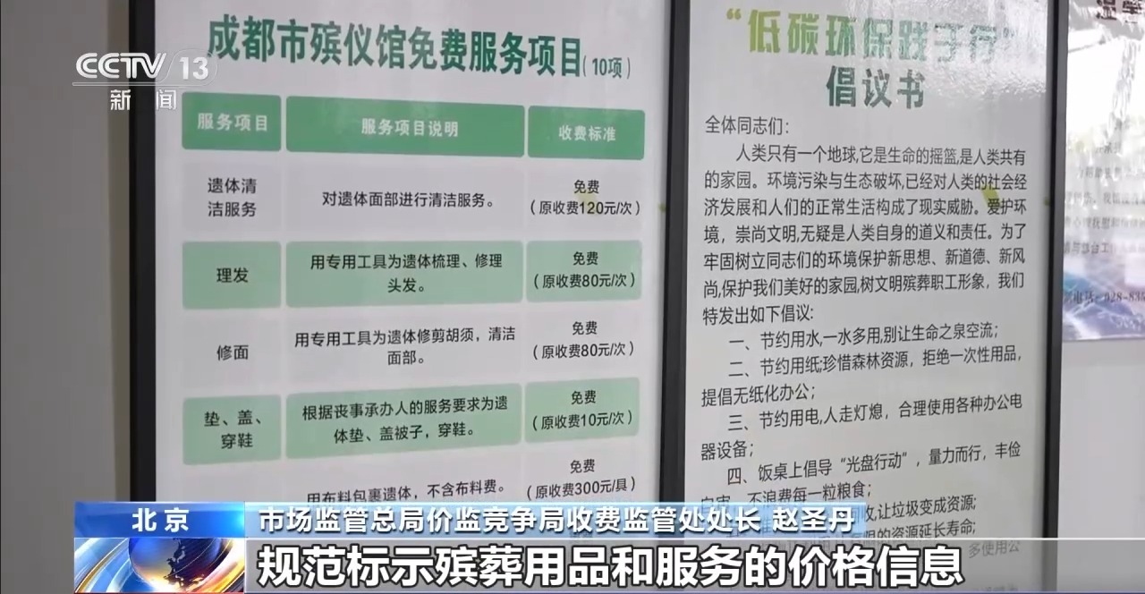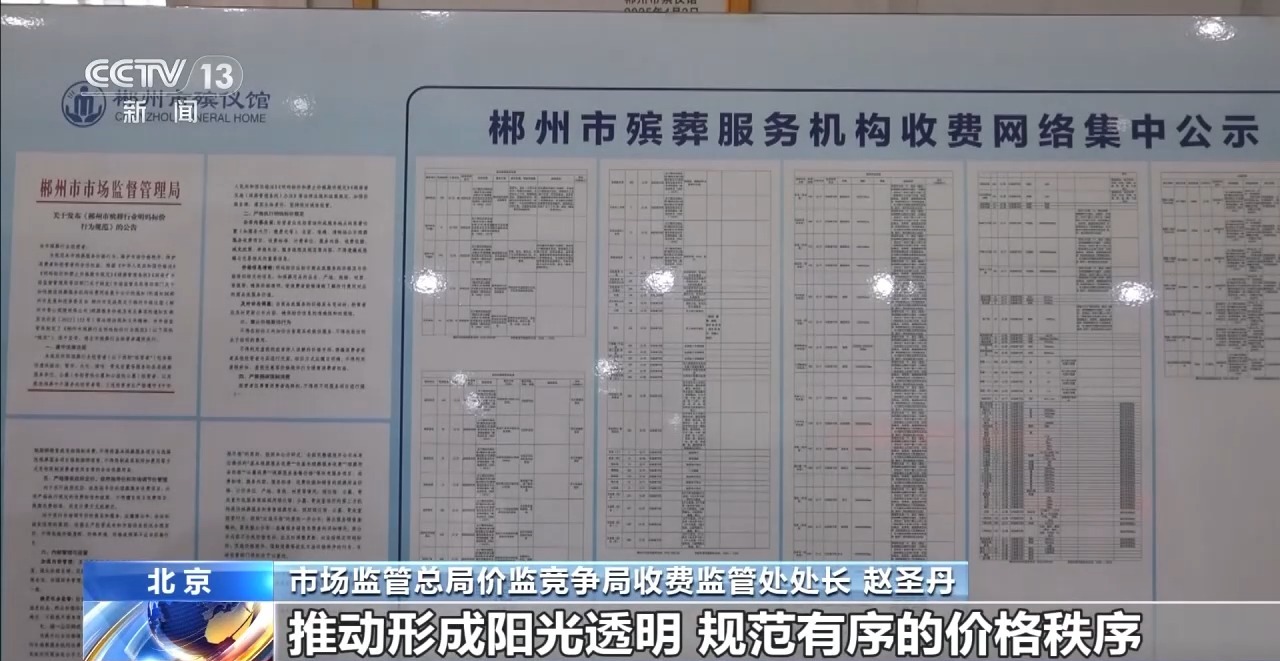 市场监管总局价监竞争局收费监管处处长 赵圣丹:各地在地市级以上民政部门官网,全面公示殡葬服务机构提供的服务项目、收费标准、服务内容和销售的殡葬用品价格、计价单位等要素,打破了殡葬行业长期存在的信息差,推动形成阳光透明、规范有序的价格秩序。