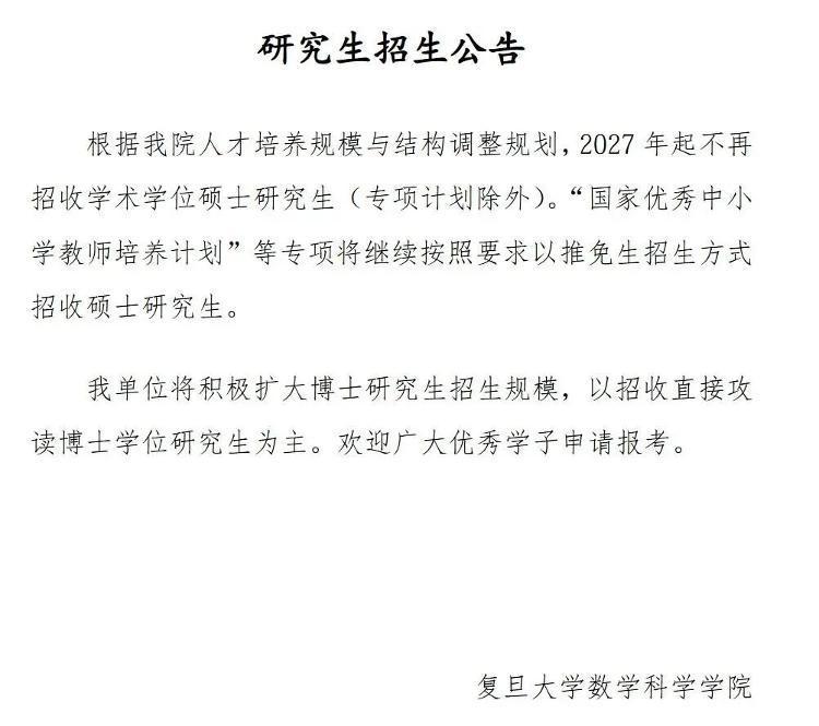 4月14日,复旦大学数学科学学院发布公告称:“根据我院人才培养规模与结构调整规划,2027年起不再招收学术学位硕士研究生(专项计划除外)。‘国家优秀中小学教师培养计划’等专项将继续按照要求以推免生招生方式招收硕士研究生。我单位将积极扩大博士研究生招生规模,以招收直接攻读博士学位研究生为主。”