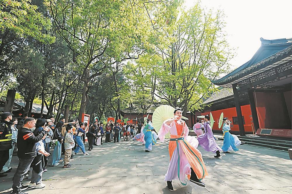 昨日11时,由“诸葛亮”引领,“刘备”“关羽”“张飞”及蜀汉书生、侍女等角色组成的巡游队伍《锦官赐福》沿主线路行进,与游客互动祈福,营造“与古贤同行”的沉浸氛围。春假清明时节,武侯祠博物馆在文物区、西区及锦里沿线精心设置多处沉浸式演艺点位,以舞蹈、情景朗诵、琵琶演奏等多元艺术形式,再现蜀汉风云。