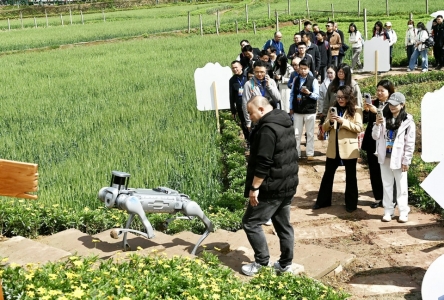 从什邡市登山博物馆背后穿越廊桥,就抵达熊猫梯田。时值3月,半人高的麦穗刚刚抽穗吐绿,沿石阶向上,姿态各异的大熊猫雕塑迎接每一位游客。